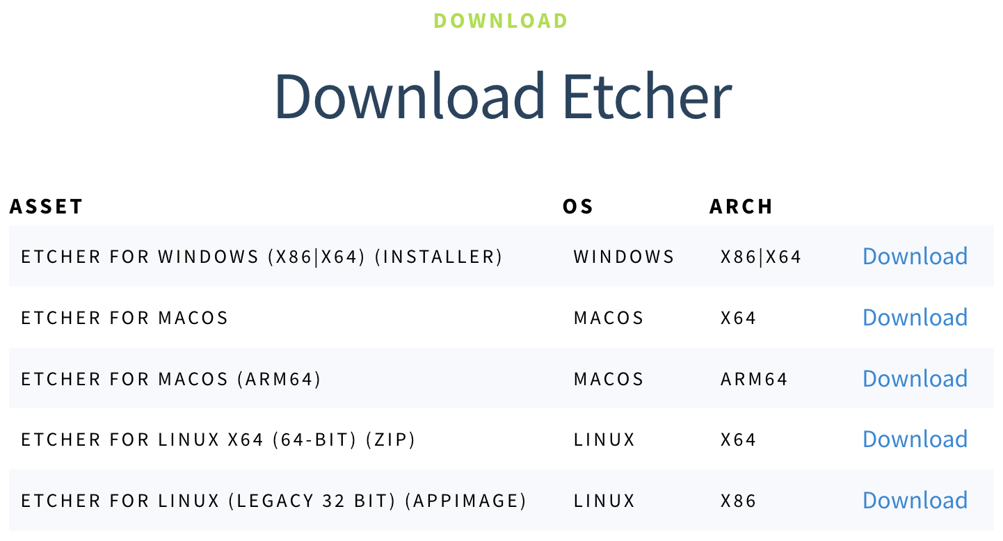 - Download balenaEtcher: https://etcher.balena.io/#download-etcher